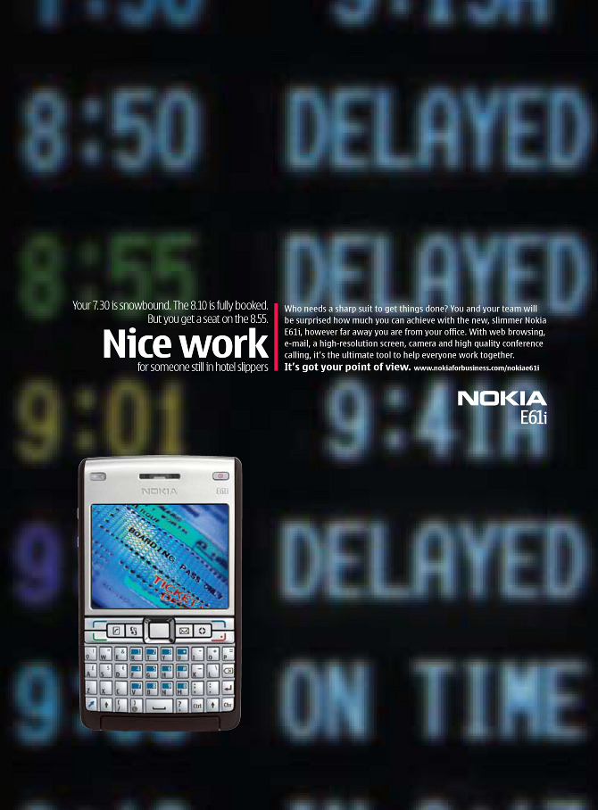 “Your 7.30 is snowbound. The 8.10 is fully booked. But you get a seat on the 8.55. Nice work for someone still in hotel slippers.” That was the start of the campaign for Nokia ES, the business to business side of things from our friends in Finland that launched the ‘It’s got your point of view’ campaign running right across the EMEA region in business titles and airports alike. Interesting to note that since it’s recent tie-in with Microsoft, this area of telecommunication business should soon be back in Nokia’s grasp. Well, until Microsoft…